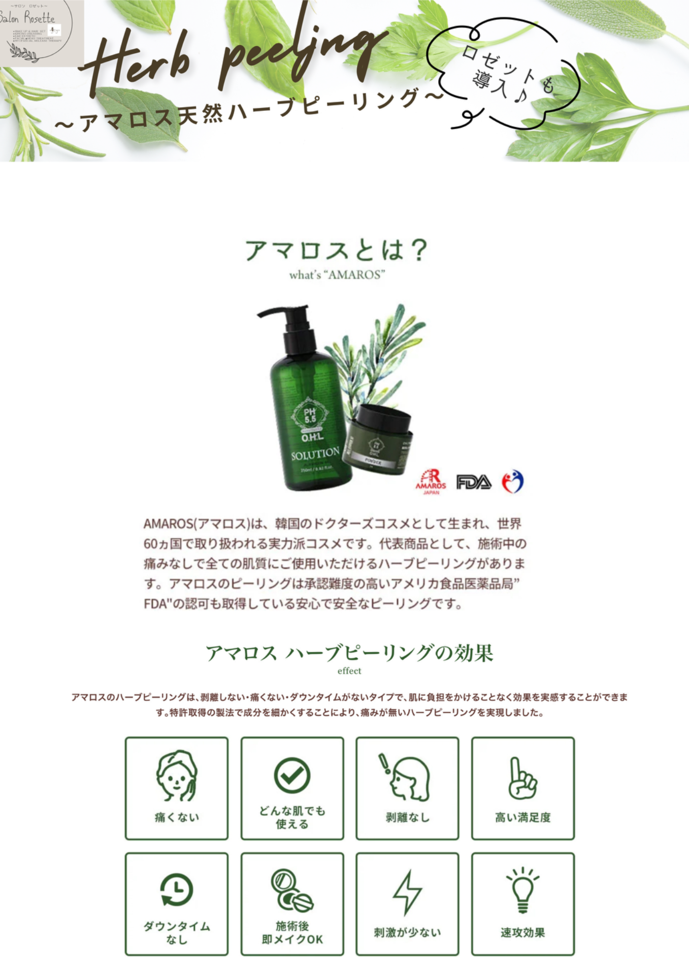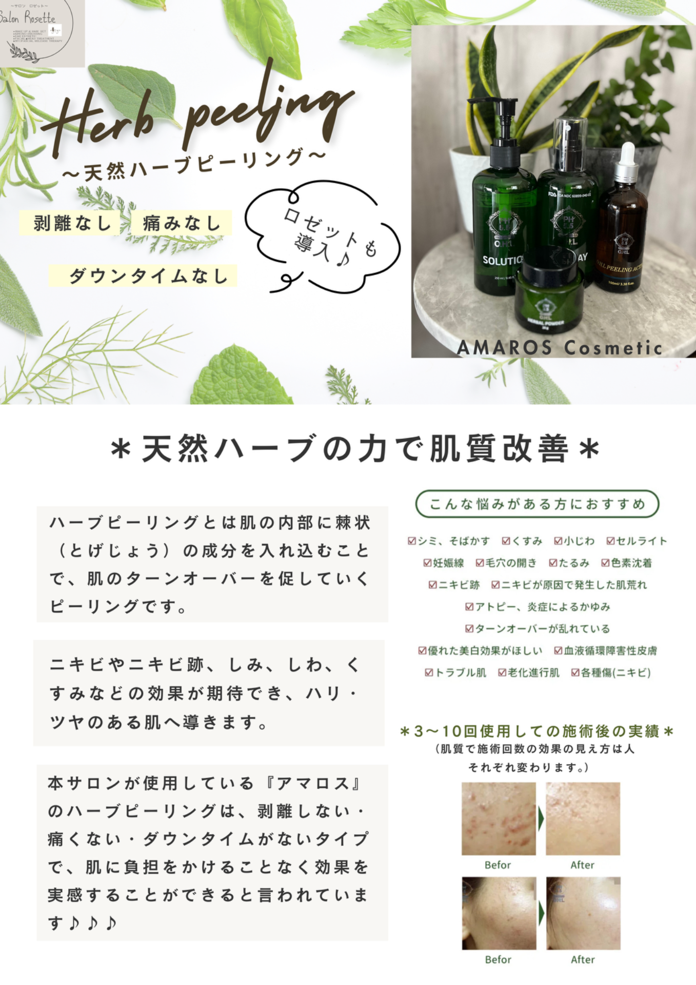 本サロンが使用している『アマロス』のハーブピーリングは、剥離しない・痛くない・ダウンタイムがない、施術後すぐにメイクもOKなタイプで、肌に負担をかけることなく効果を実感することができると言われています♪♪♪